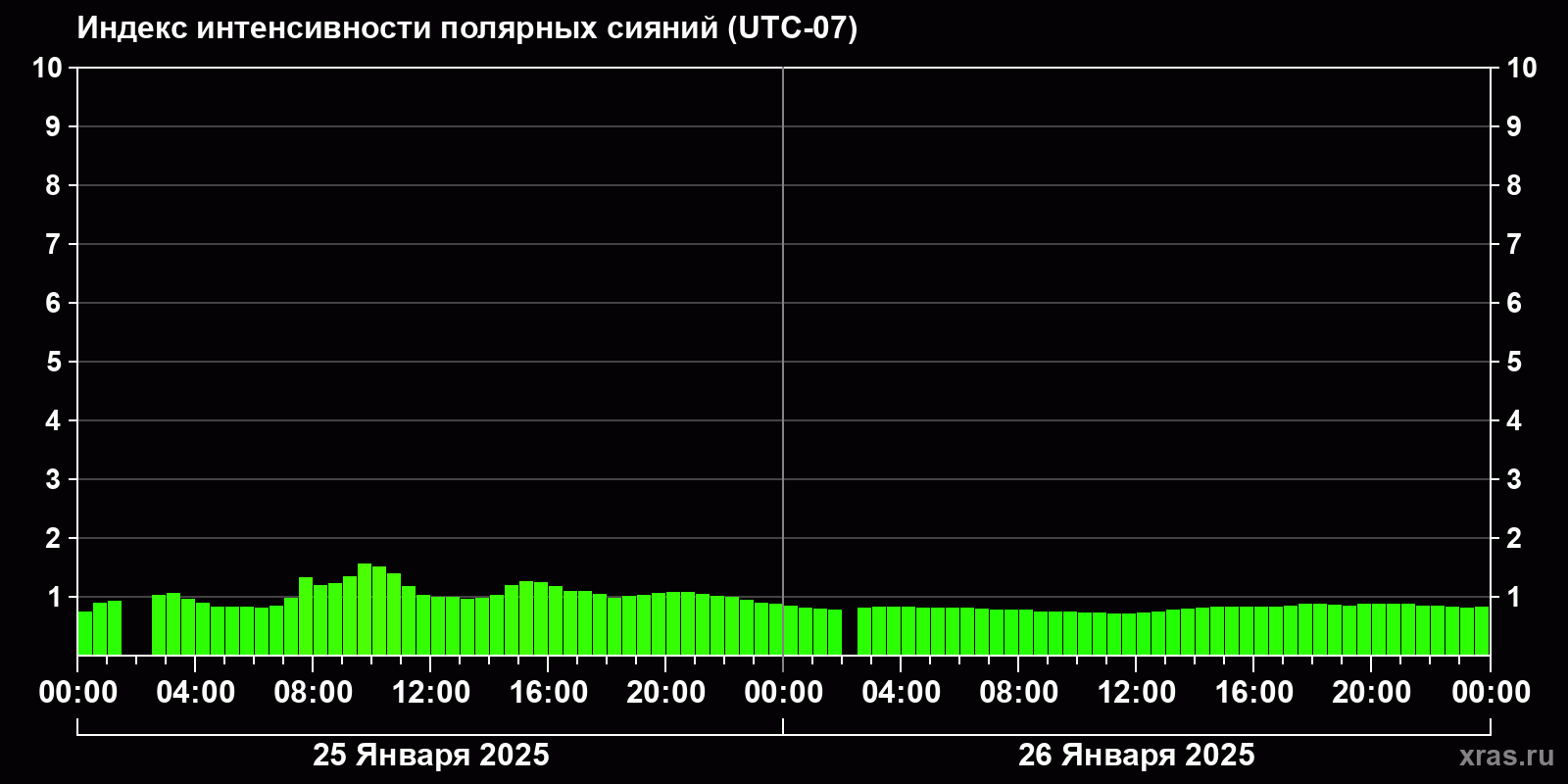 Изменения индекса интенсивности полярных сияний с 2025-01-25 по 2025-01-26 по местному времени