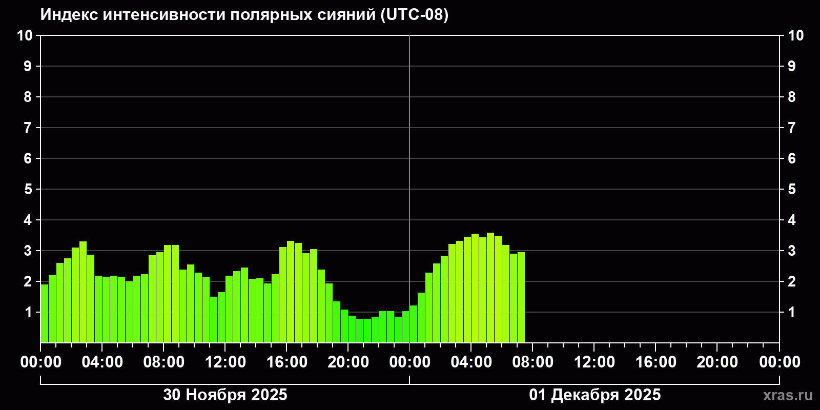 Изменения индекса интенсивности полярных сияний с 2025-11-30 по 2025-12-01 по местному времени