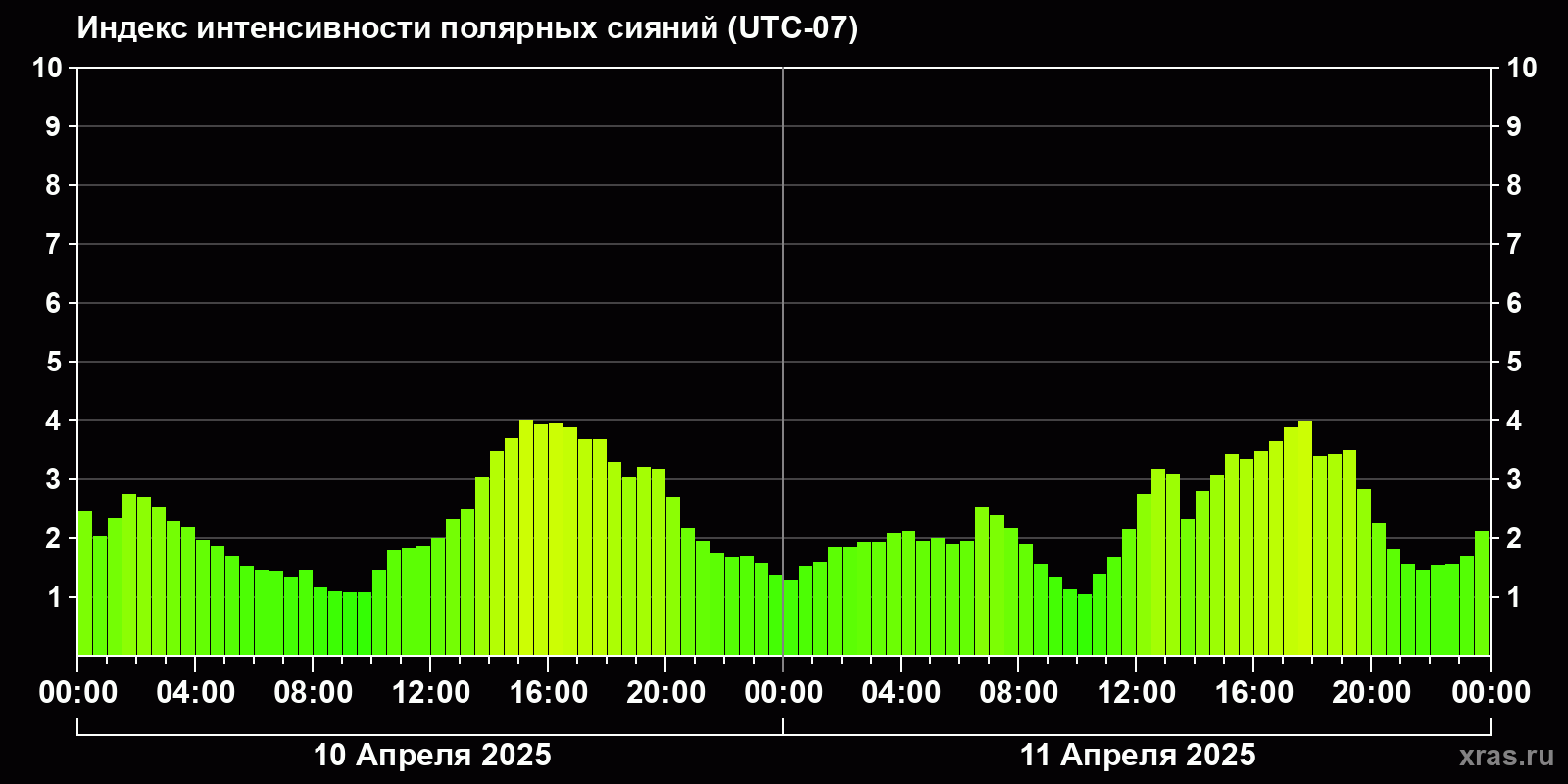 Изменения индекса интенсивности полярных сияний с 2025-04-10 по 2025-04-11 по местному времени
