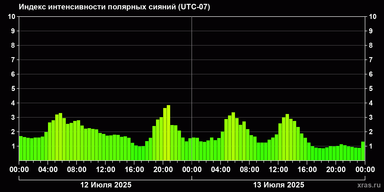 Изменения индекса интенсивности полярных сияний с 2025-07-12 по 2025-07-13 по местному времени