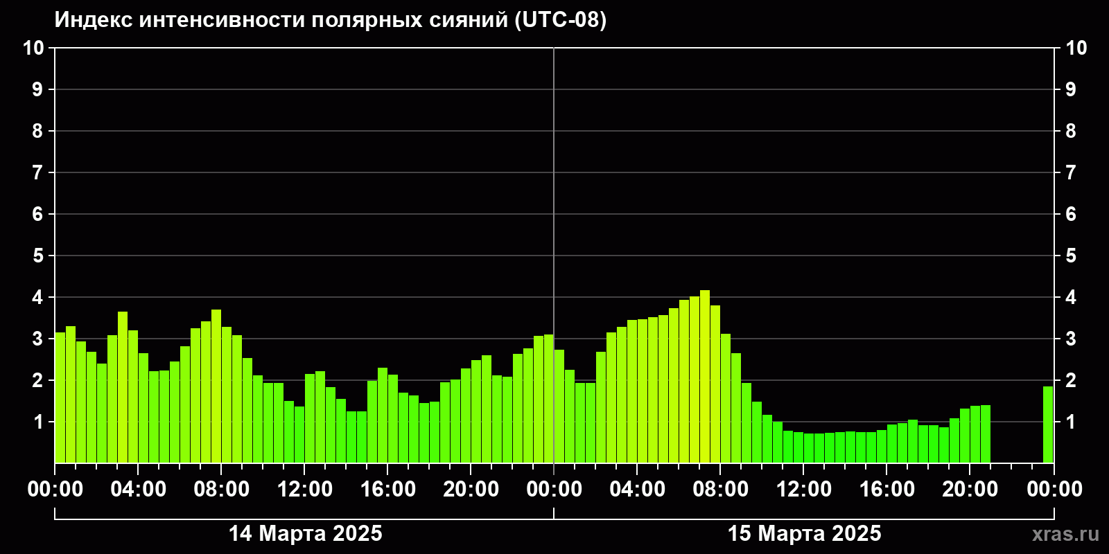 Изменения индекса интенсивности полярных сияний с 2025-03-14 по 2025-03-15 по местному времени