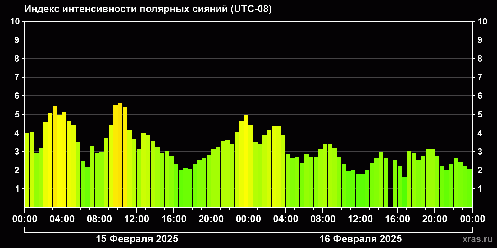 Изменения индекса интенсивности полярных сияний с 2025-02-15 по 2025-02-16 по местному времени