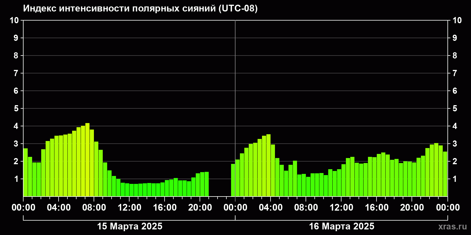 Изменения индекса интенсивности полярных сияний с 2025-03-15 по 2025-03-16 по местному времени