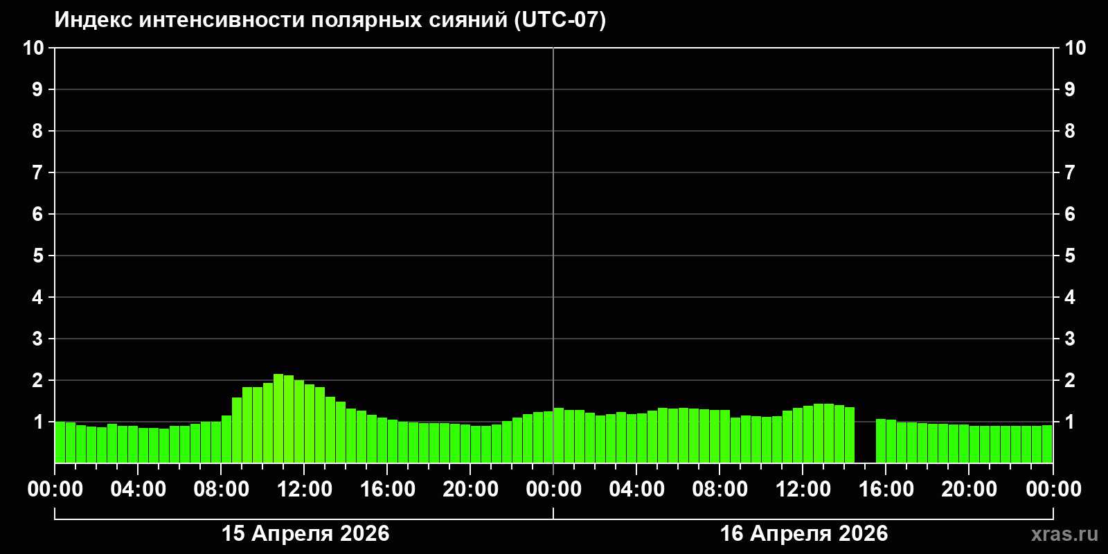 Изменения индекса интенсивности полярных сияний с 2026-04-15 по 2026-04-16 по местному времени