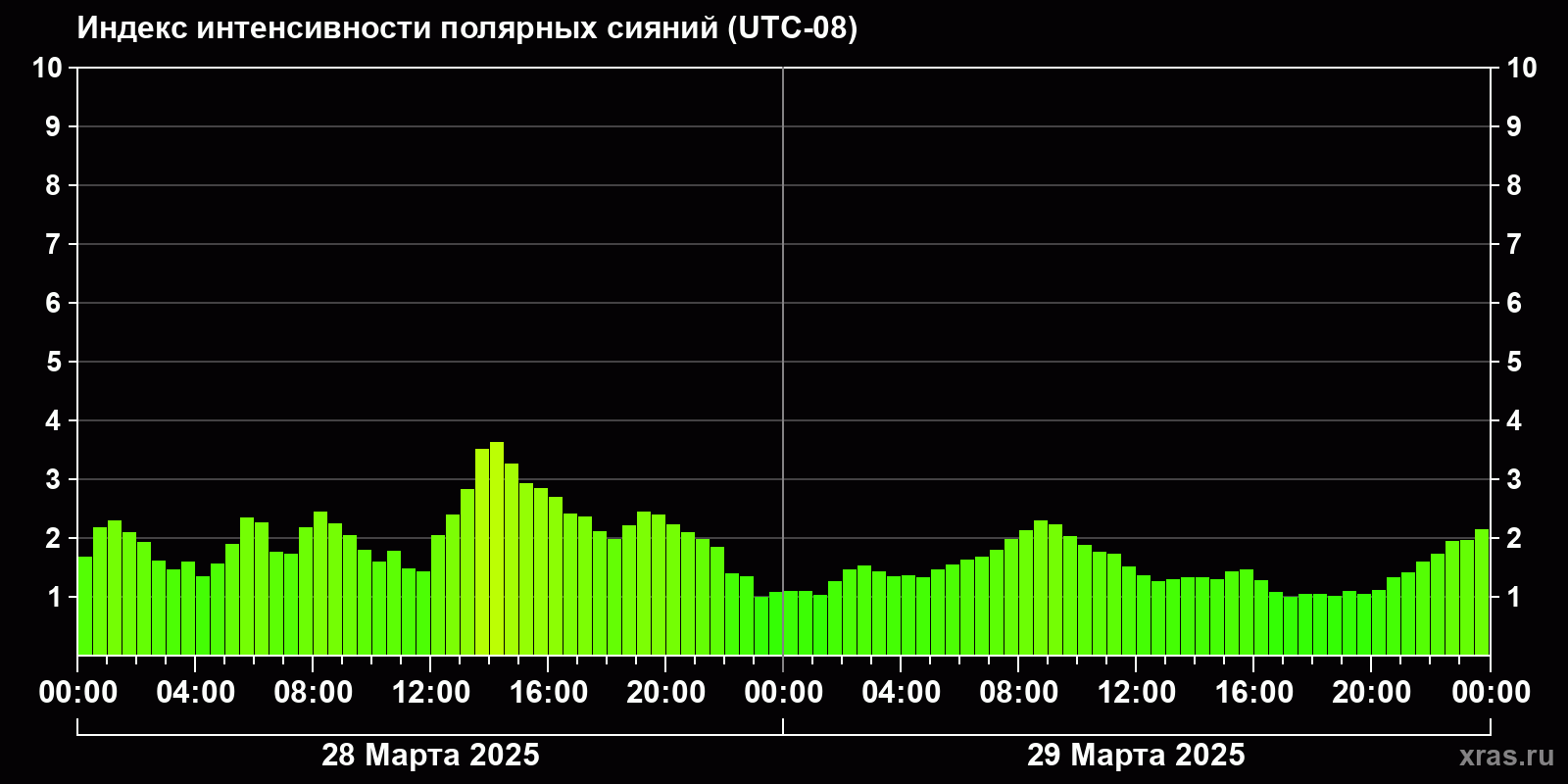 Изменения индекса интенсивности полярных сияний с 2025-03-28 по 2025-03-29 по местному времени