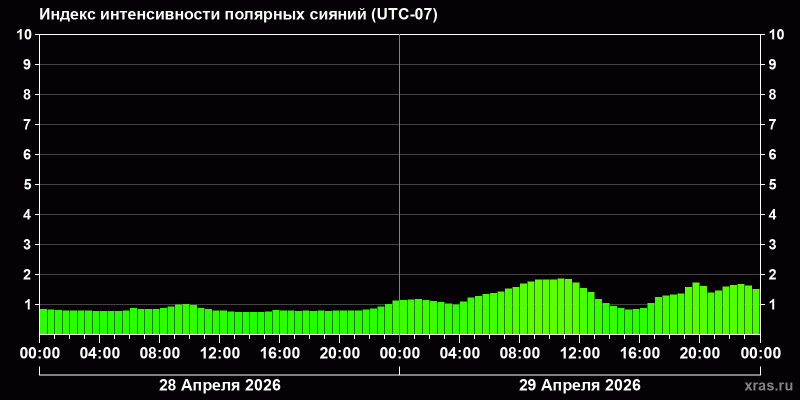 Изменения индекса интенсивности полярных сияний с 2026-04-28 по 2026-04-29 по местному времени