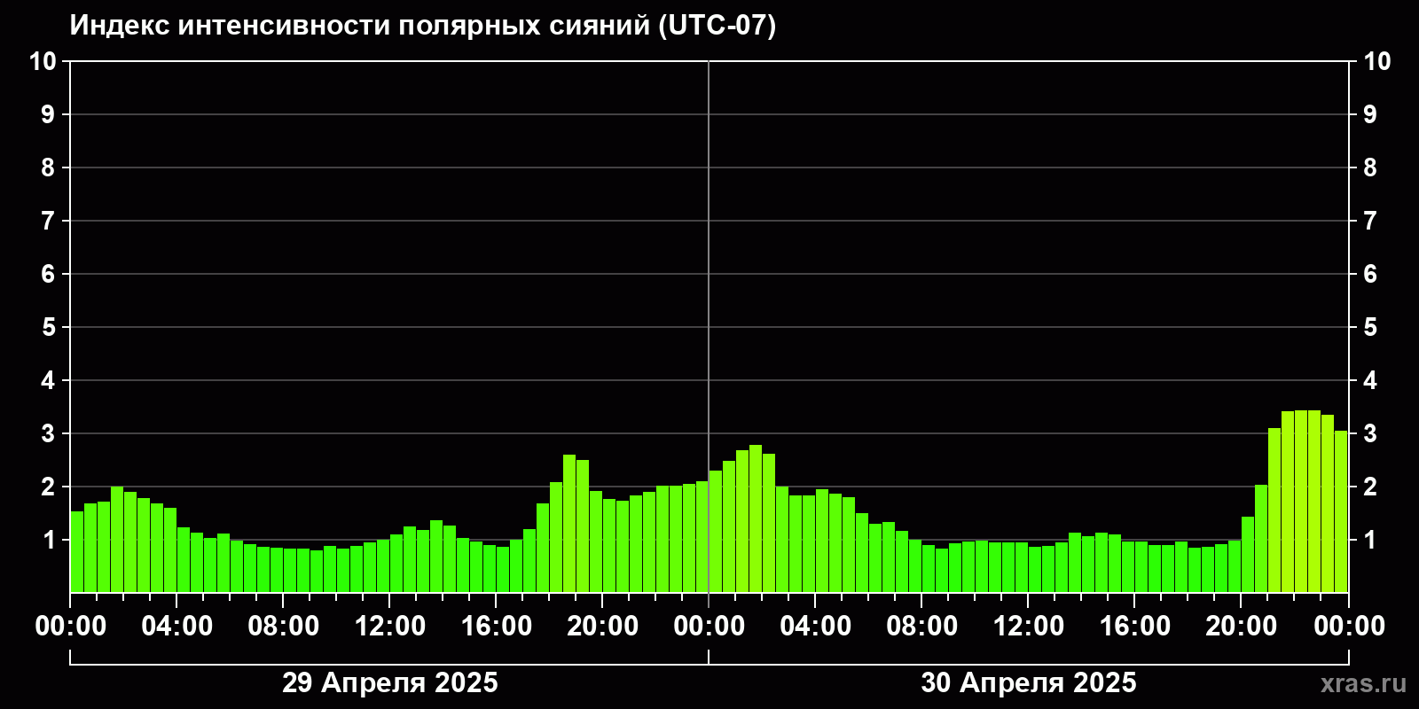 Изменения индекса интенсивности полярных сияний с 2025-04-29 по 2025-04-30 по местному времени