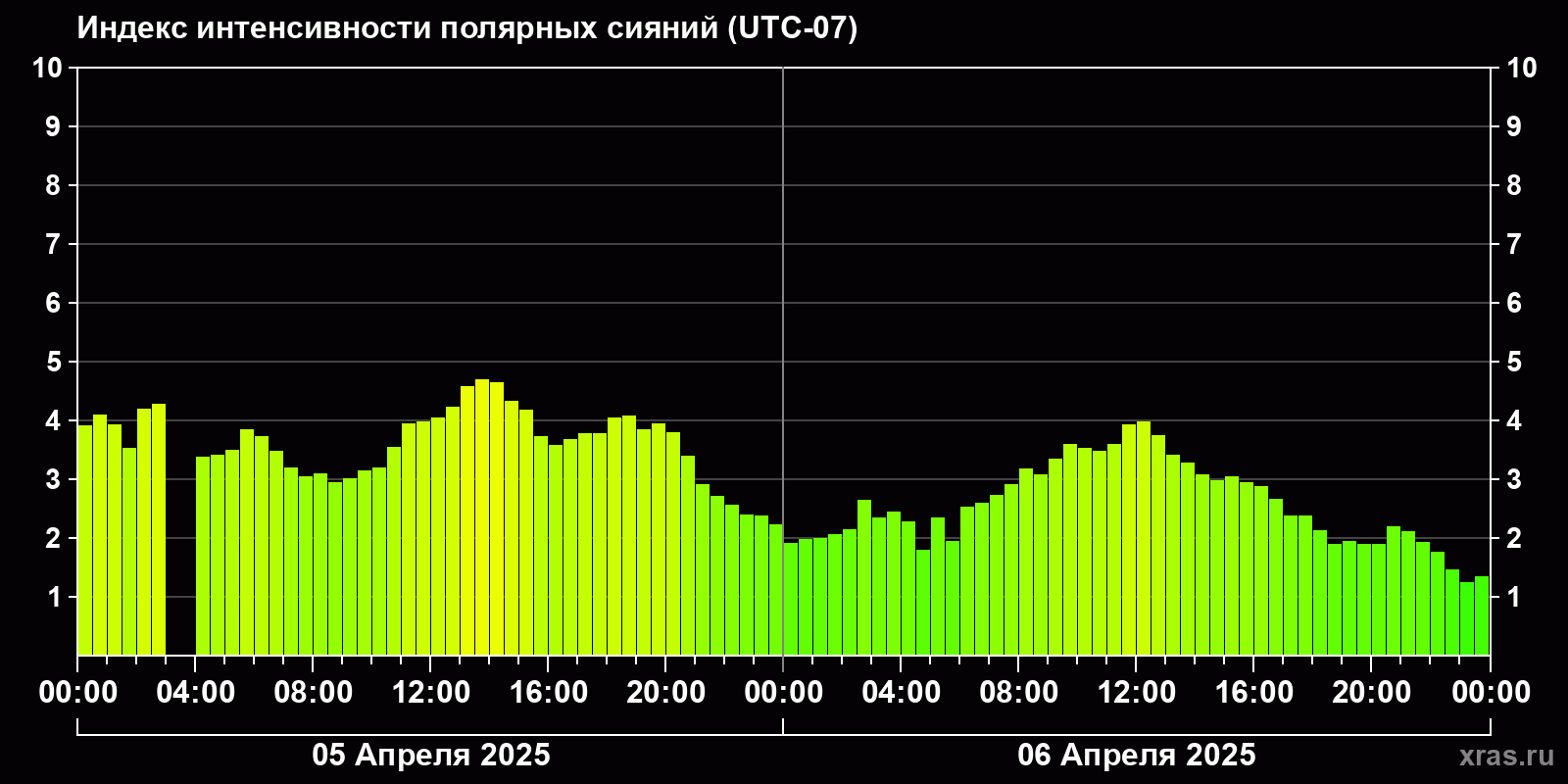 Изменения индекса интенсивности полярных сияний с 2025-04-05 по 2025-04-06 по местному времени