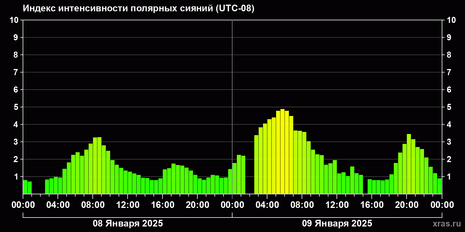 Изменения индекса интенсивности полярных сияний с 2025-01-08 по 2025-01-09 по местному времени