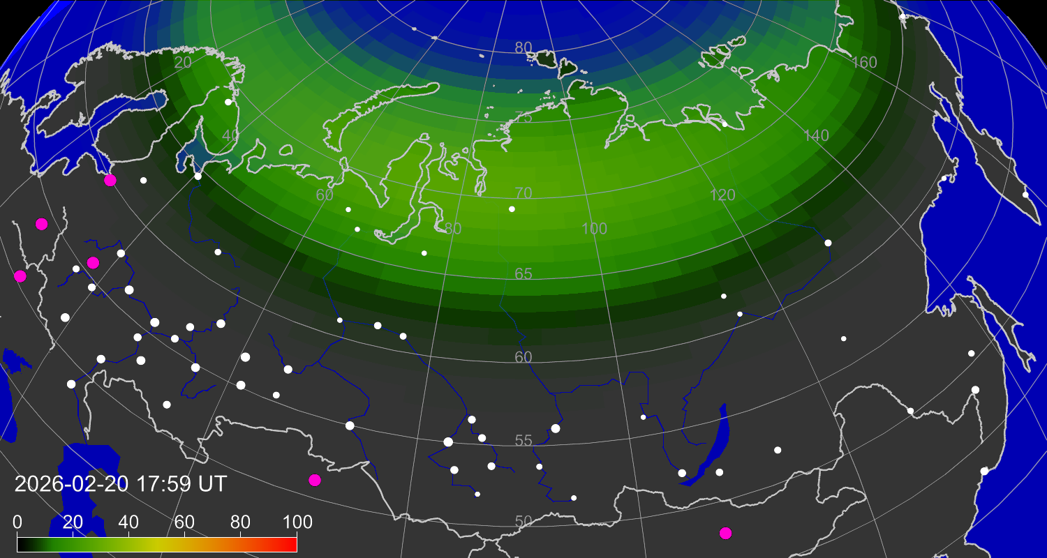Изменения и часовой прогноз индекса интенсивности полярных сияний с 2026-02-19 по 2026-02-20