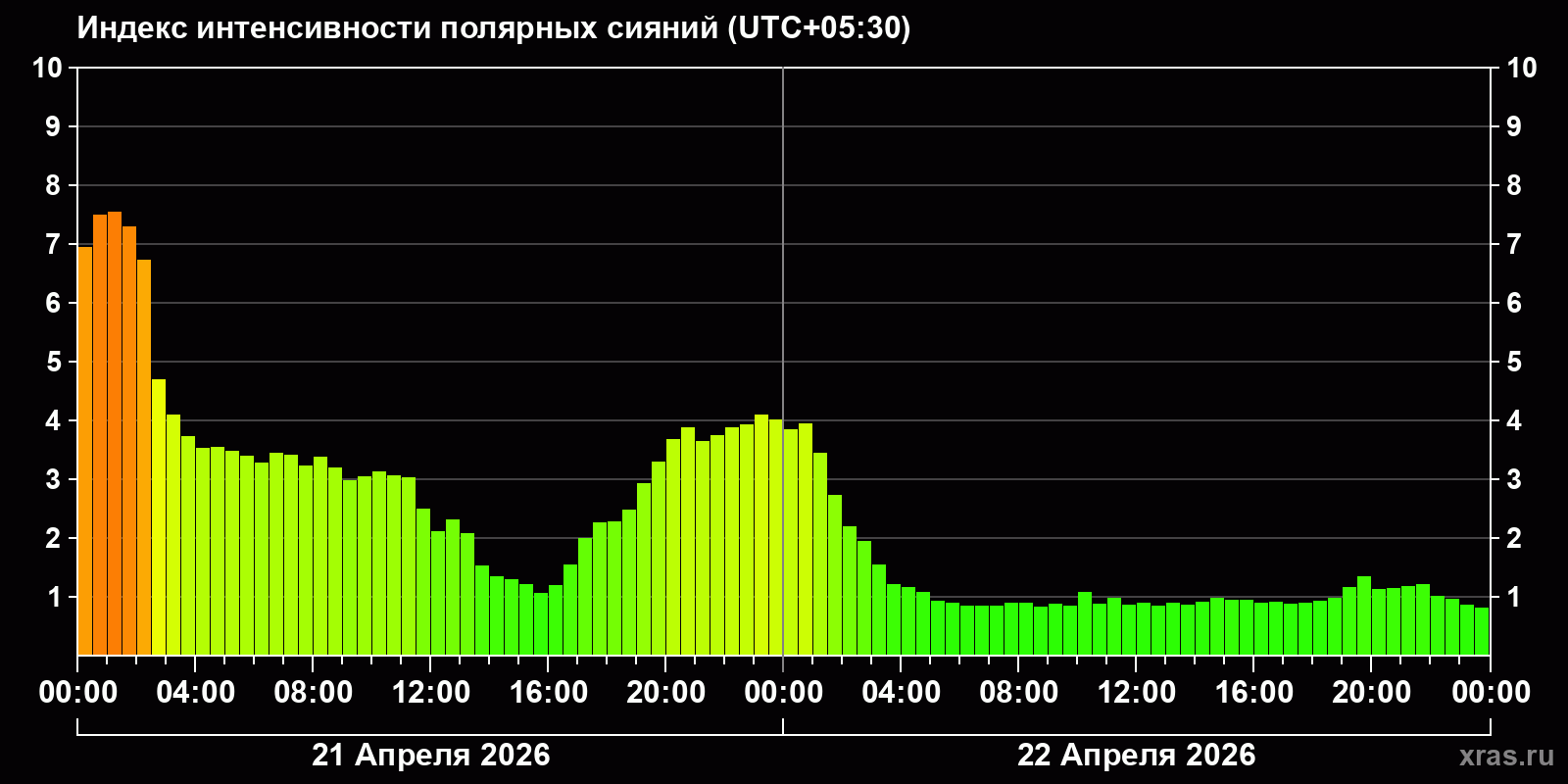 Изменения индекса интенсивности полярных сияний с 2026-04-21 по 2026-04-22 по местному времени