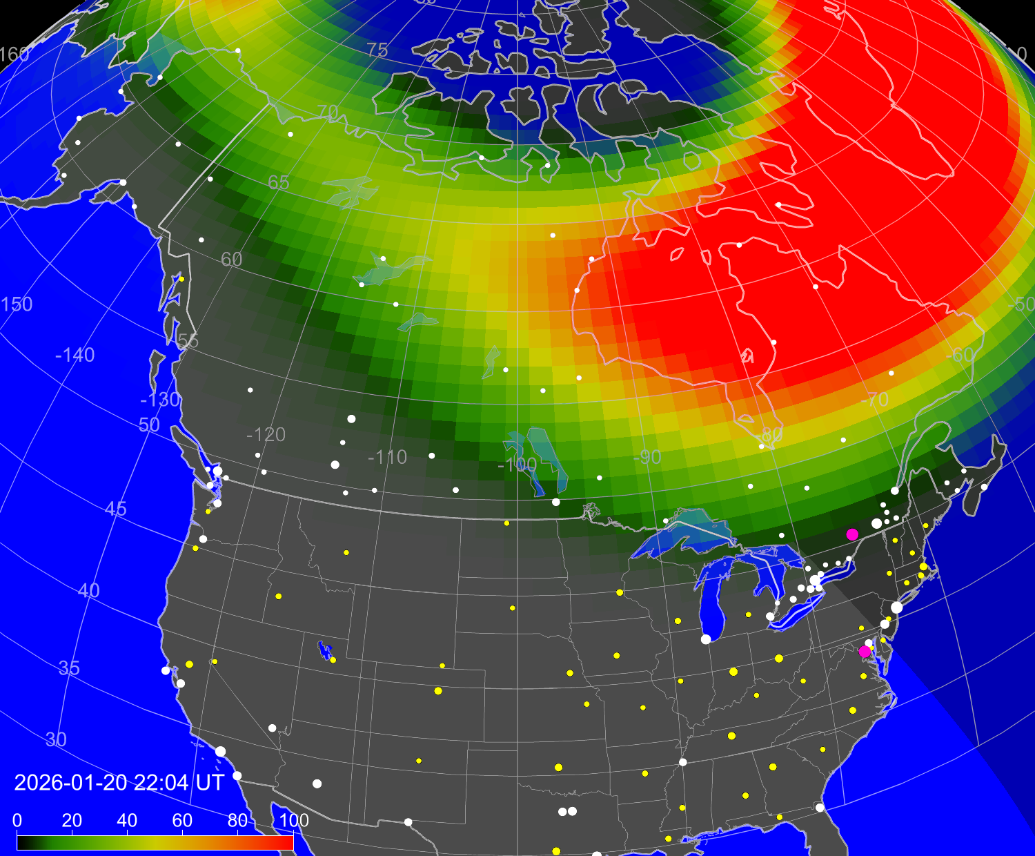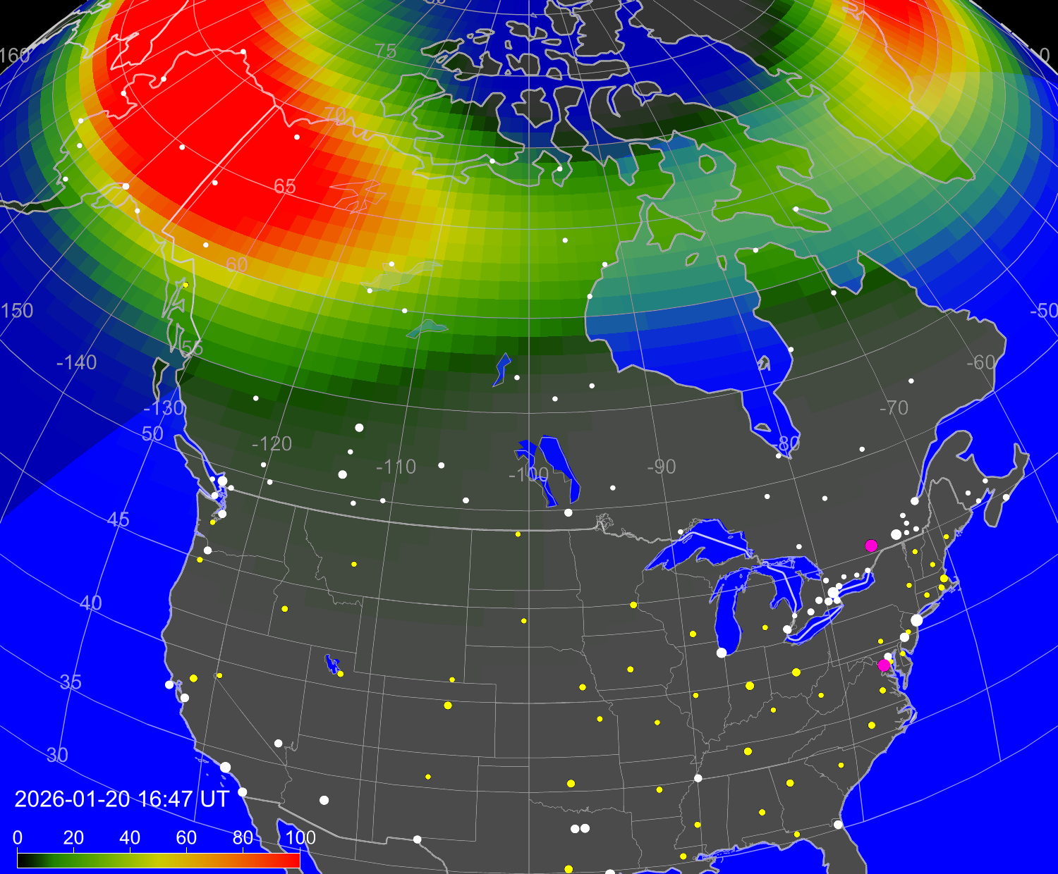 Изменения и часовой прогноз индекса интенсивности полярных сияний с 2026-01-20 по 2026-01-21