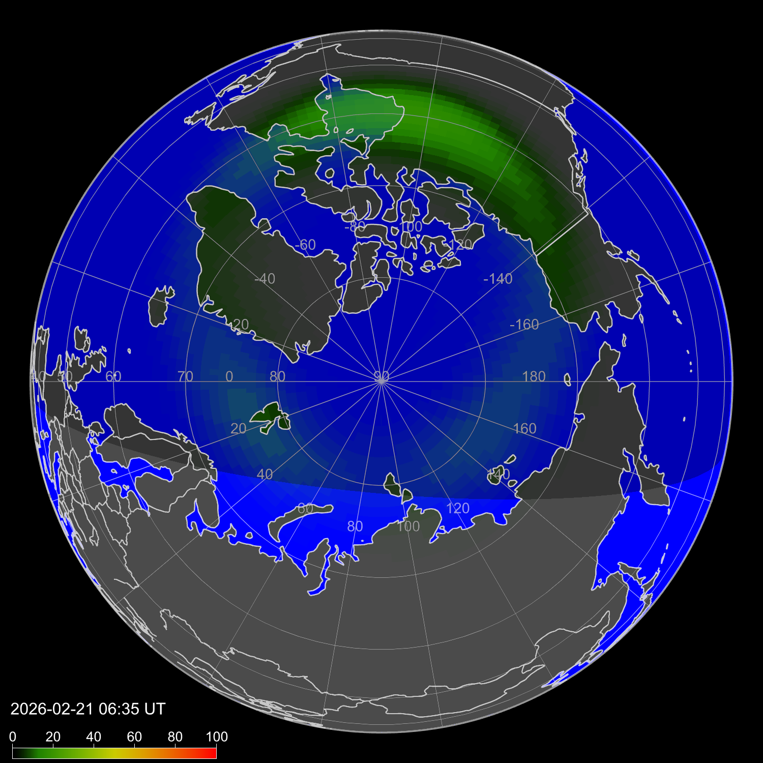 Индекс интенсивности полярных сияний и теоретически возможная широта наблюдений для ночного времени в западном полушарии