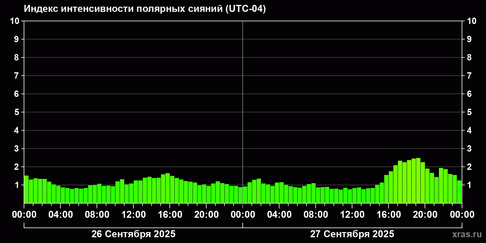 Изменения индекса интенсивности полярных сияний с 2025-09-26 по 2025-09-27 по местному времени