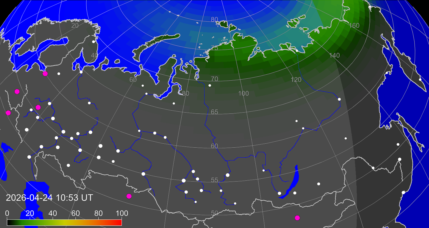 Вероятность полярных сияний в городах Российской Федерации
