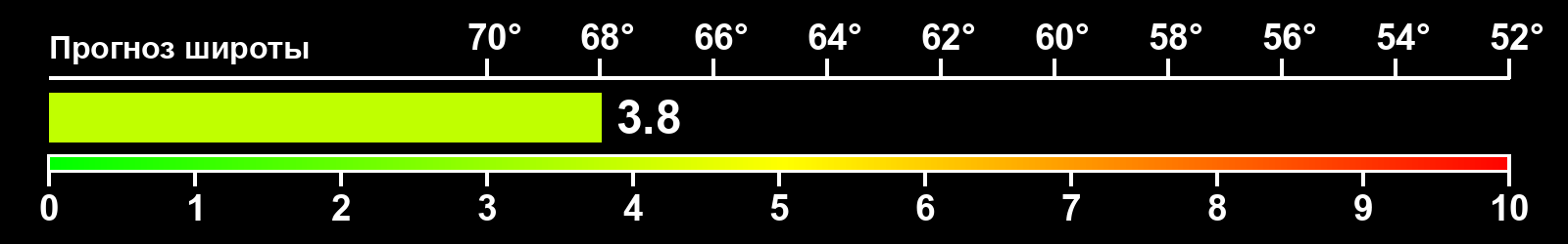 Индекс интенсивности полярных сияний и теоретически возможная широта наблюдений для ночного времени в восточном полушарии по состоянию на 2026-04-21 23:47 (конец дня) по местному времени