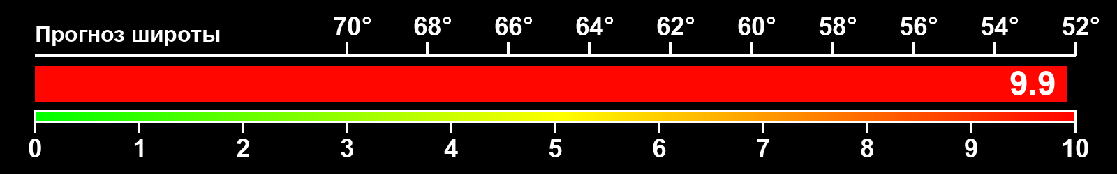 Индекс интенсивности полярных сияний и теоретически возможная широта наблюдений для ночного времени в восточном полушарии по состоянию на 2026-01-11 23:53 (конец дня) по местному времени