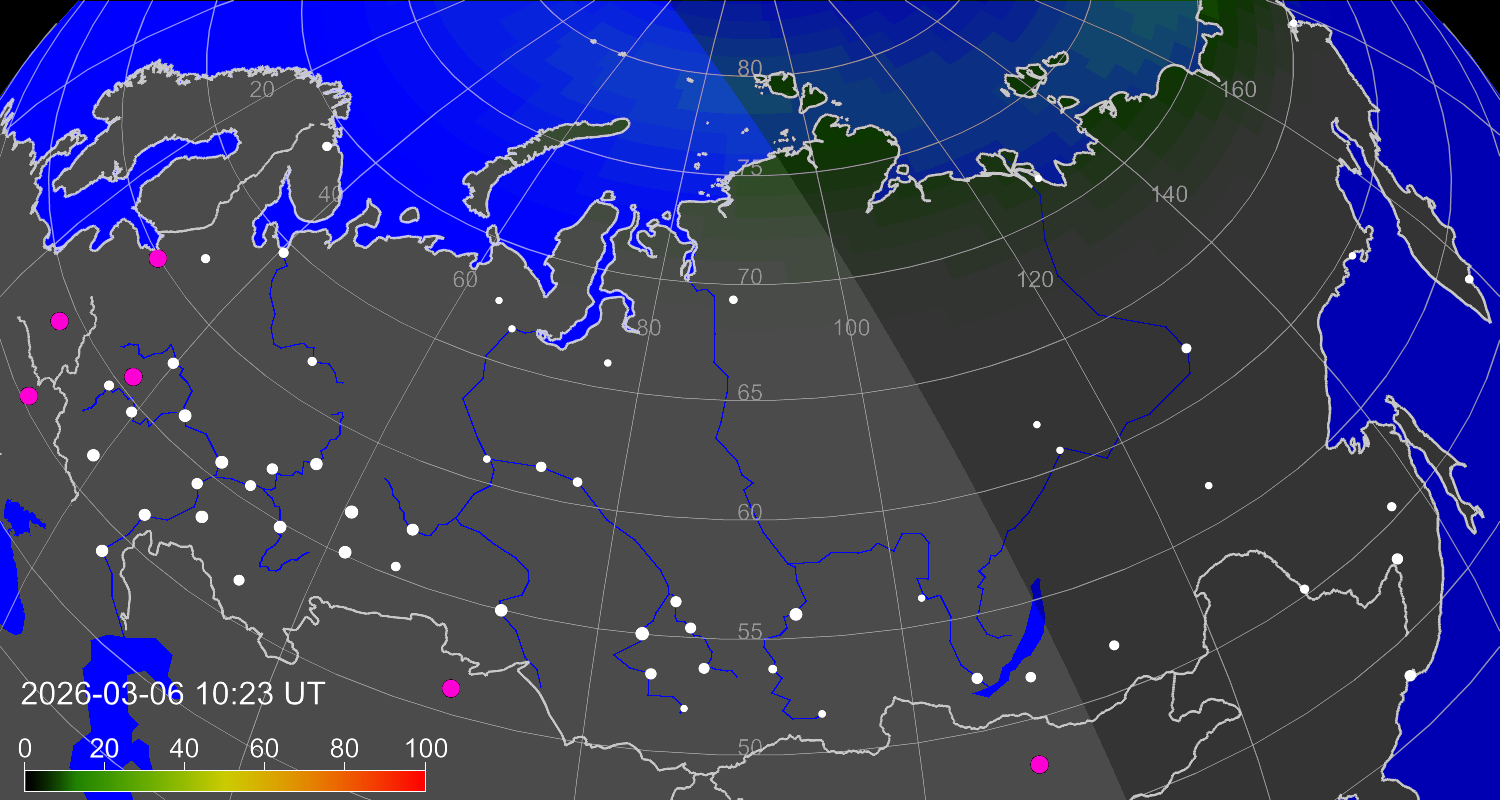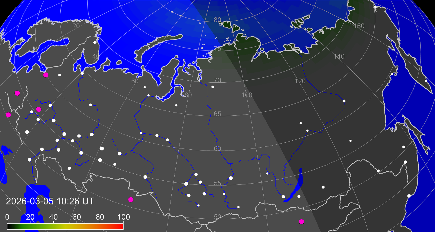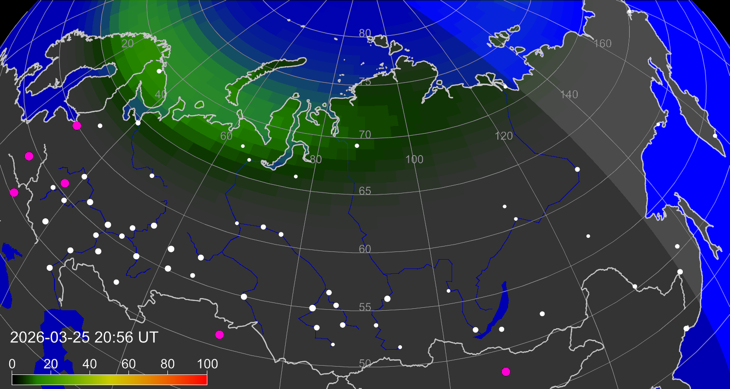 Вероятность полярных сияний в городах Российской Федерации