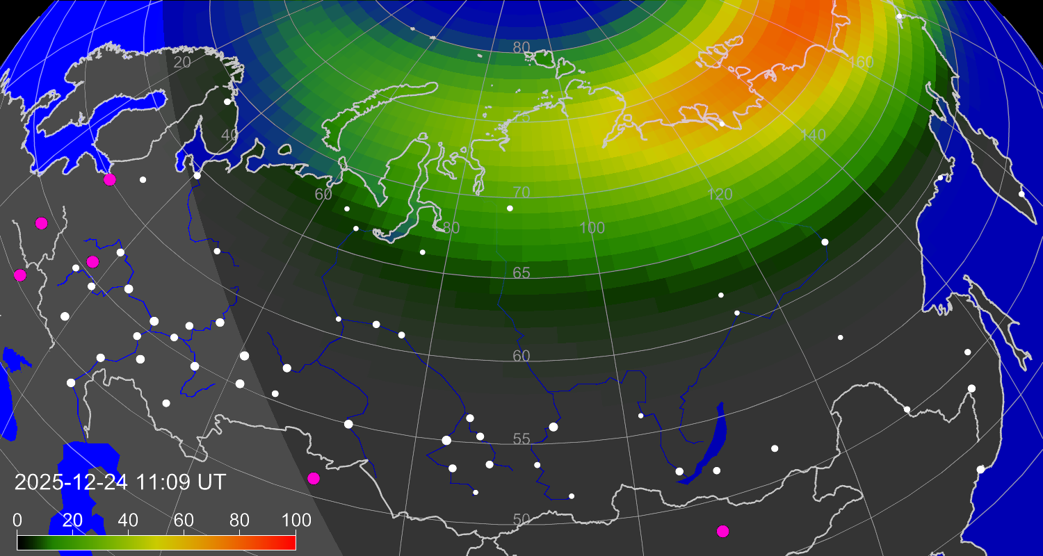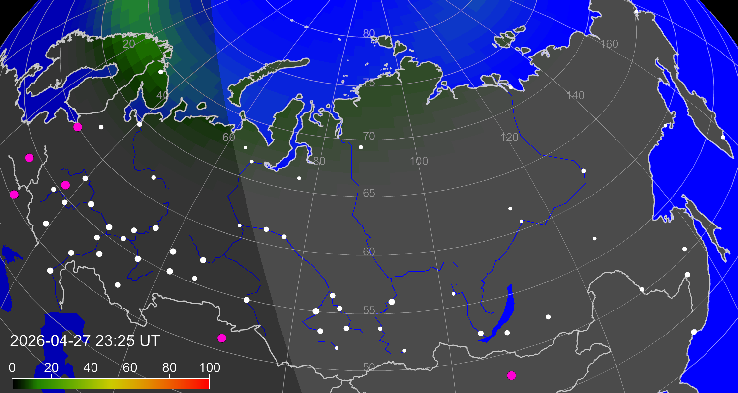 Вероятность полярных сияний в городах Российской Федерации