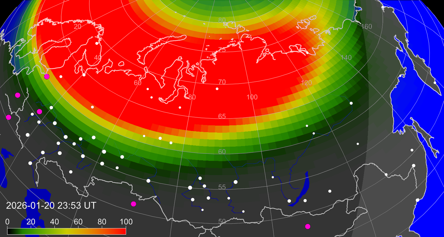 Индекс интенсивности полярных сияний и теоретически возможная широта наблюдений для ночного времени в восточном полушарии
