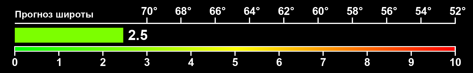 Индекс интенсивности полярных сияний и теоретически возможная широта наблюдений для ночного времени в восточном полушарии по состоянию на 2026-03-15 23:46 (конец дня) по местному времени