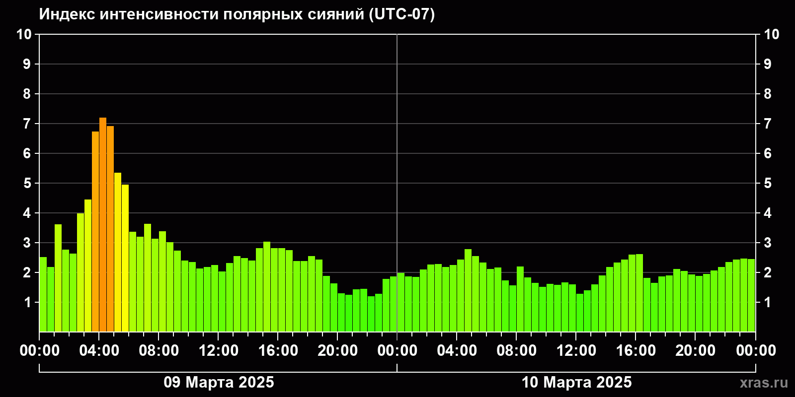 Изменения индекса интенсивности полярных сияний с 2025-03-09 по 2025-03-10 по местному времени