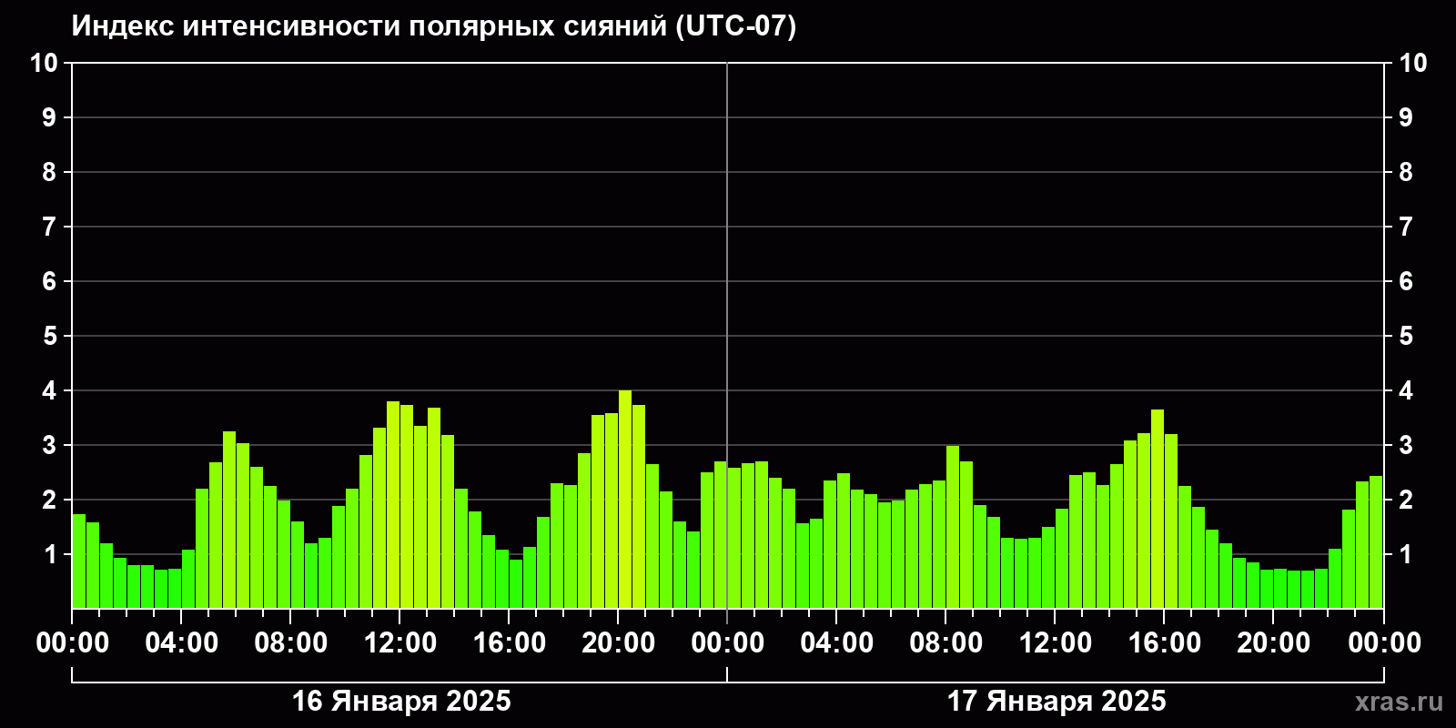 Изменения индекса интенсивности полярных сияний с 2025-01-16 по 2025-01-17 по местному времени