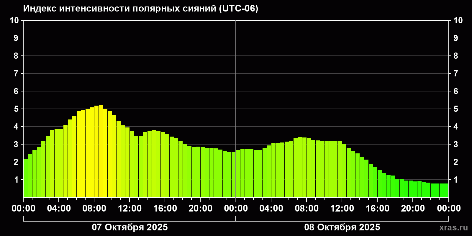 Изменения индекса интенсивности полярных сияний с 2025-10-07 по 2025-10-08 по местному времени