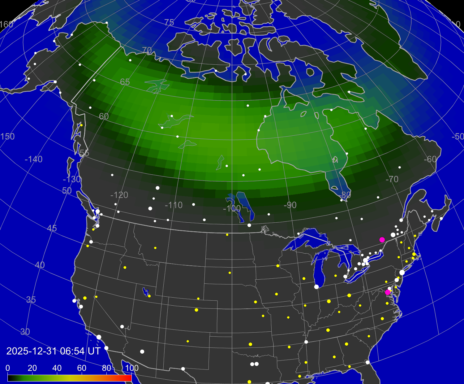 Изменения и часовой прогноз индекса интенсивности полярных сияний с 2025-12-31 по 2026-01-01