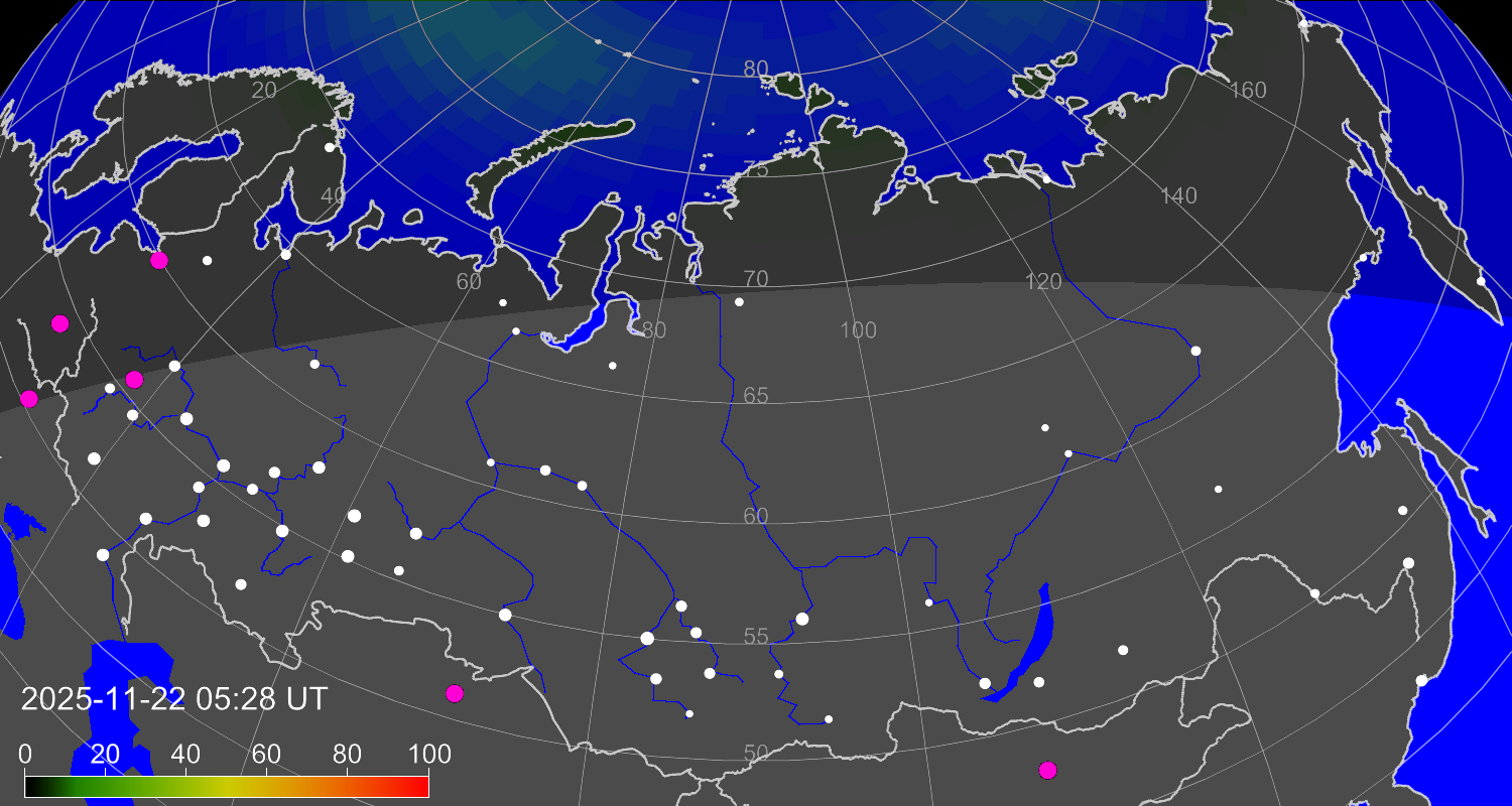 Индекс интенсивности полярных сияний и теоретически возможная широта наблюдений для ночного времени в восточном полушарии