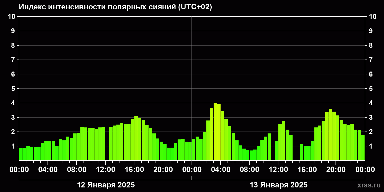 Изменения индекса интенсивности полярных сияний с 2025-01-12 по 2025-01-13 по местному времени