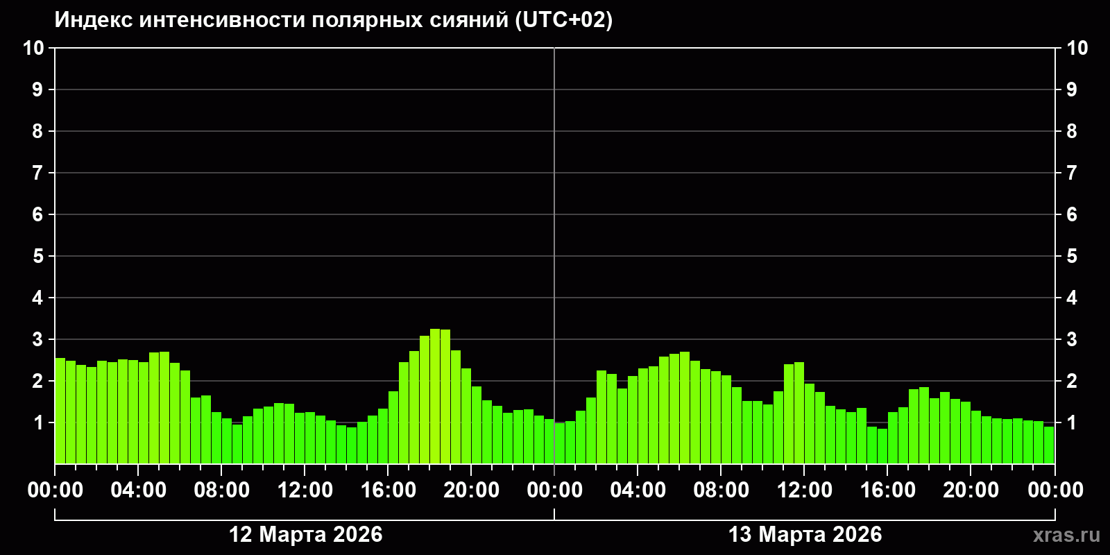 Изменения индекса интенсивности полярных сияний с 2026-03-12 по 2026-03-13 по местному времени