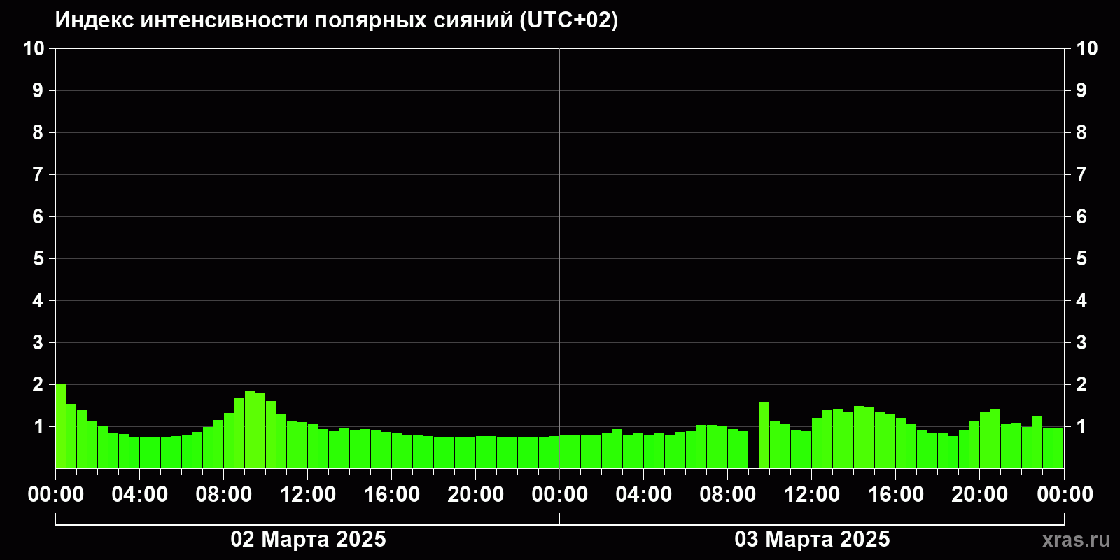 Изменения индекса интенсивности полярных сияний с 2025-03-02 по 2025-03-03 по местному времени