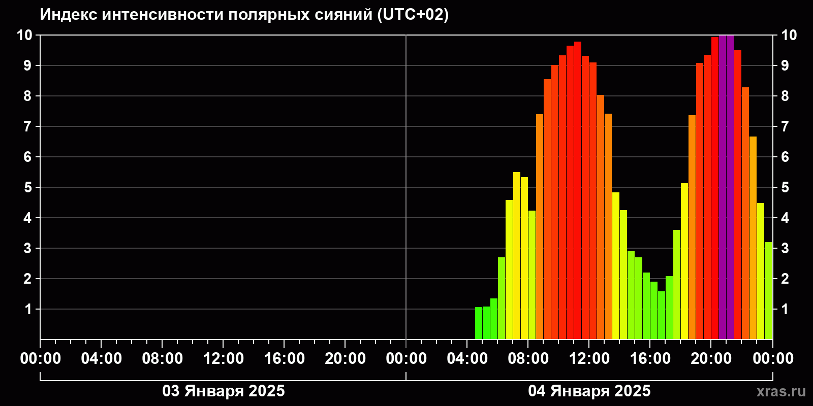 Изменения индекса интенсивности полярных сияний с 2025-01-03 по 2025-01-04 по местному времени