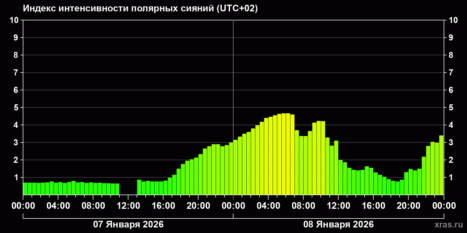 Изменения индекса интенсивности полярных сияний с 2026-01-07 по 2026-01-08 по местному времени