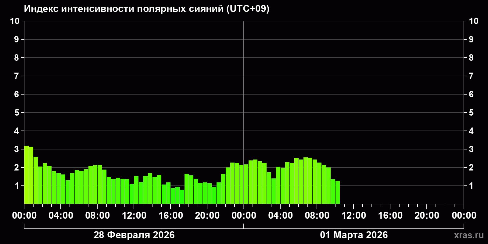 Изменения индекса интенсивности полярных сияний с 2026-02-28 по 2026-03-01 по местному времени