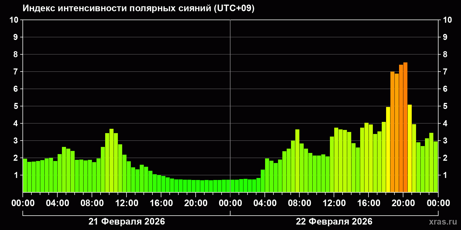 Изменения индекса интенсивности полярных сияний с 2026-02-21 по 2026-02-22 по местному времени