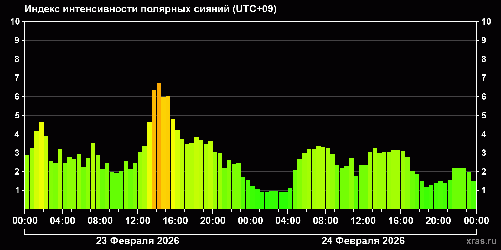 Изменения индекса интенсивности полярных сияний с 2026-02-23 по 2026-02-24 по местному времени