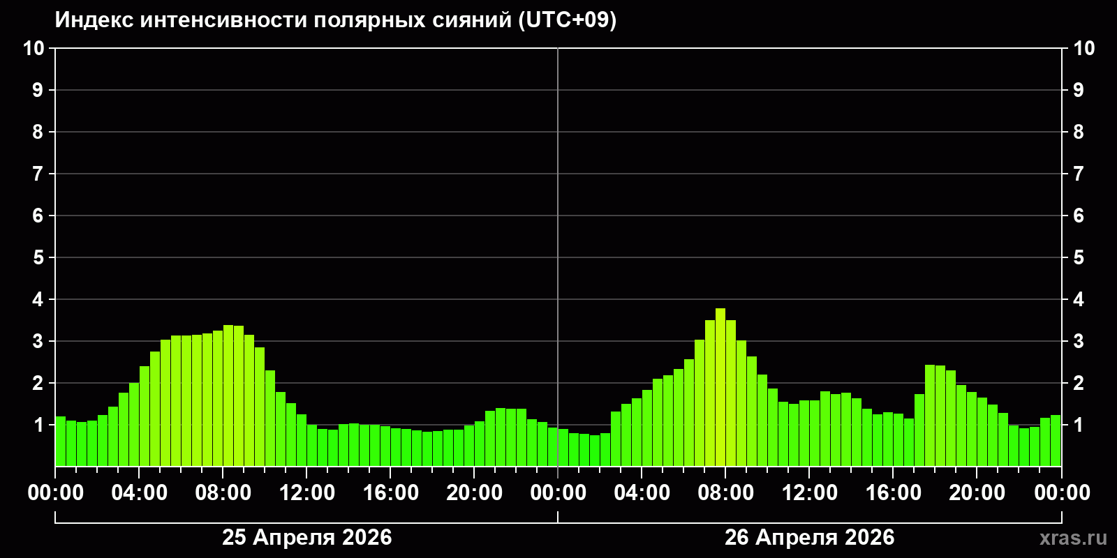 Изменения индекса интенсивности полярных сияний с 2026-04-25 по 2026-04-26 по местному времени