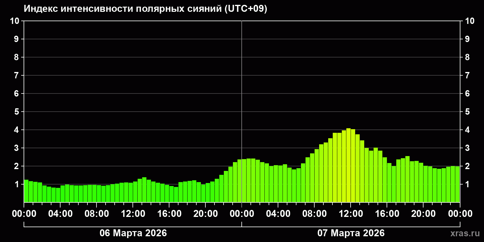 Изменения индекса интенсивности полярных сияний с 2026-03-06 по 2026-03-07 по местному времени