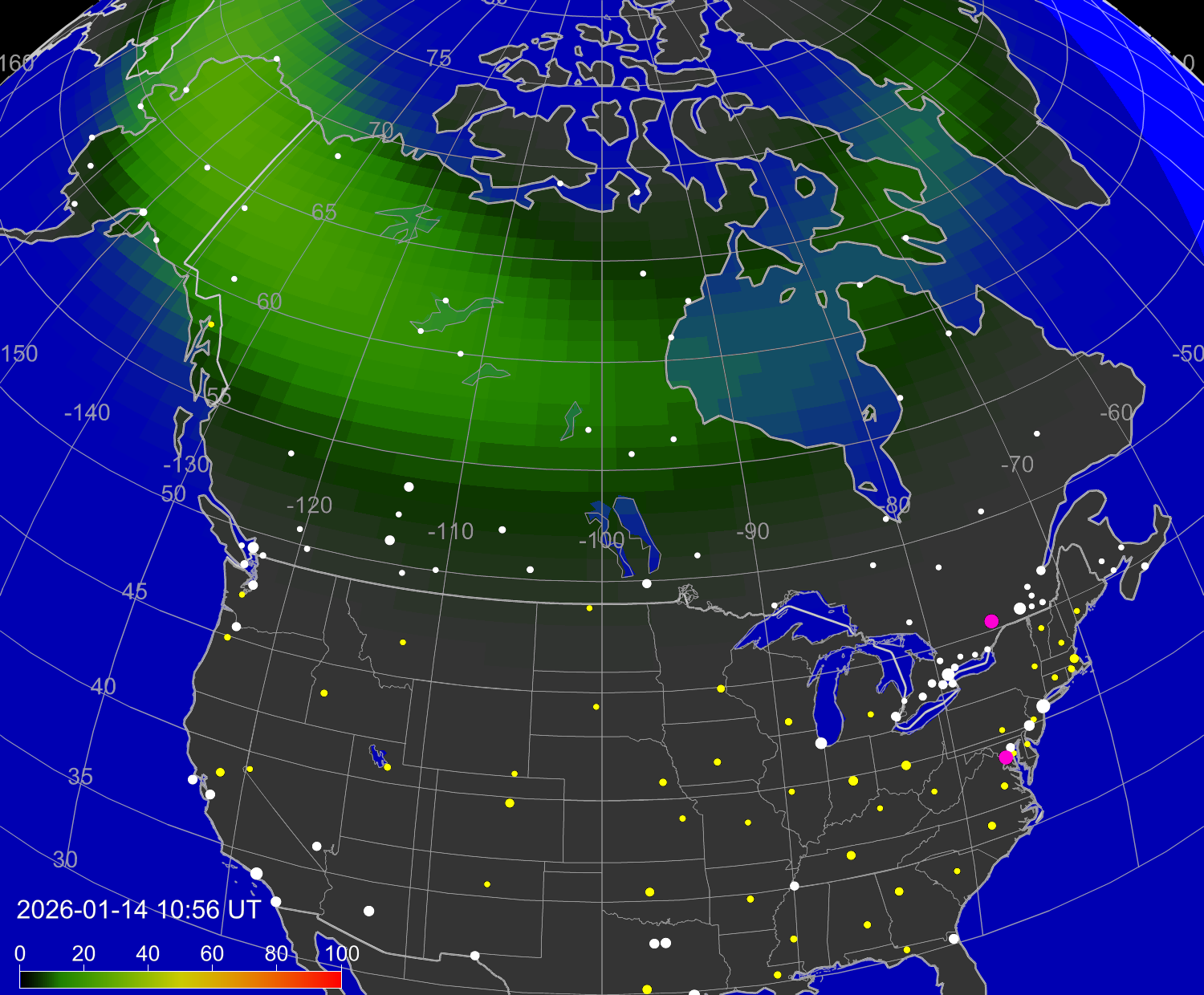 Изменения и часовой прогноз индекса интенсивности полярных сияний с 2026-01-13 по 2026-01-14