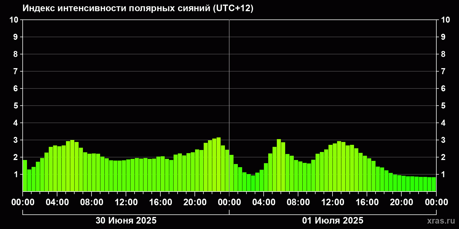 Изменения индекса интенсивности полярных сияний с 2025-07-01 по 2025-07-02 по местному времени