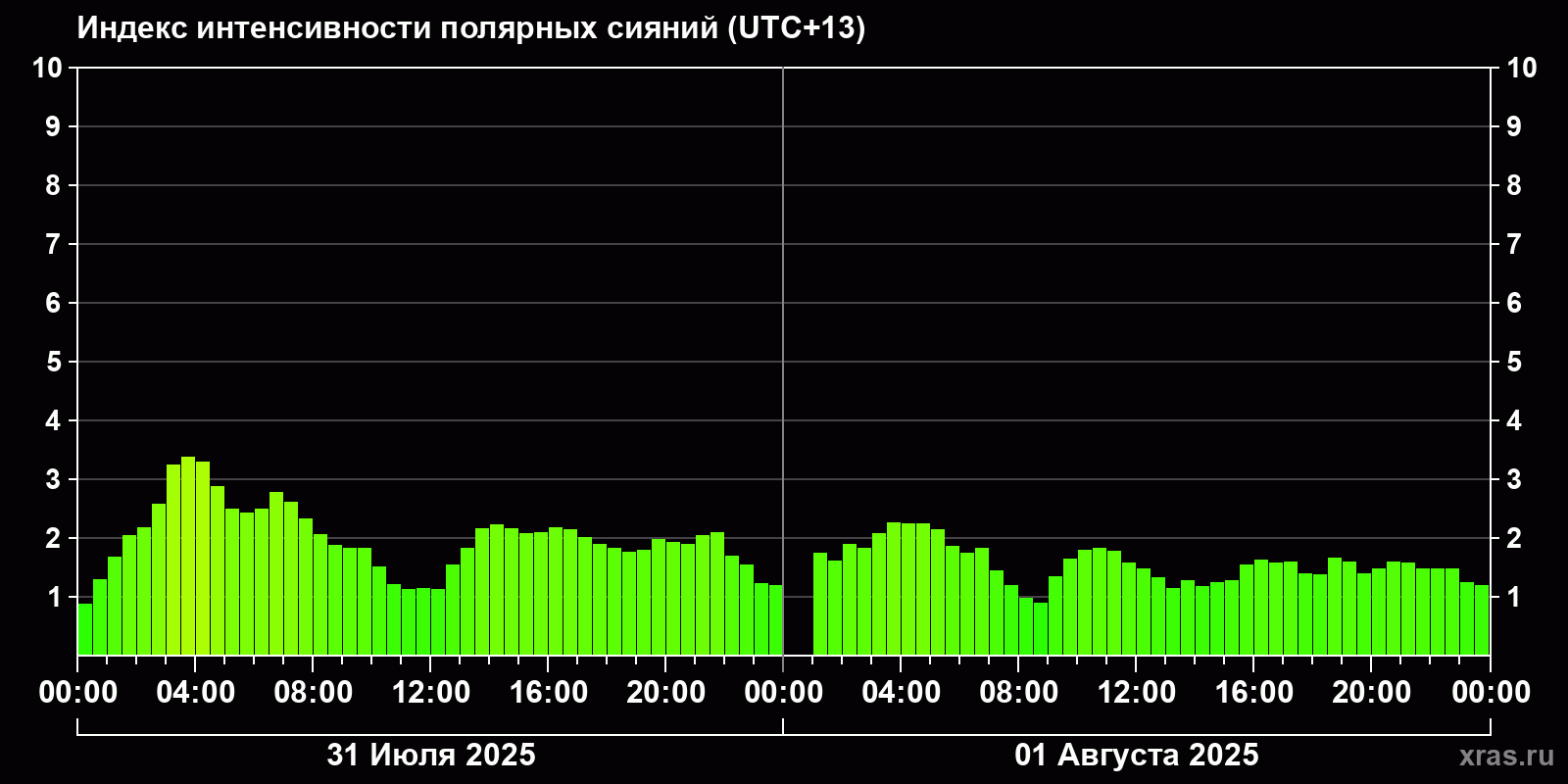 Изменения индекса интенсивности полярных сияний с 2025-07-31 по 2025-08-01 по местному времени