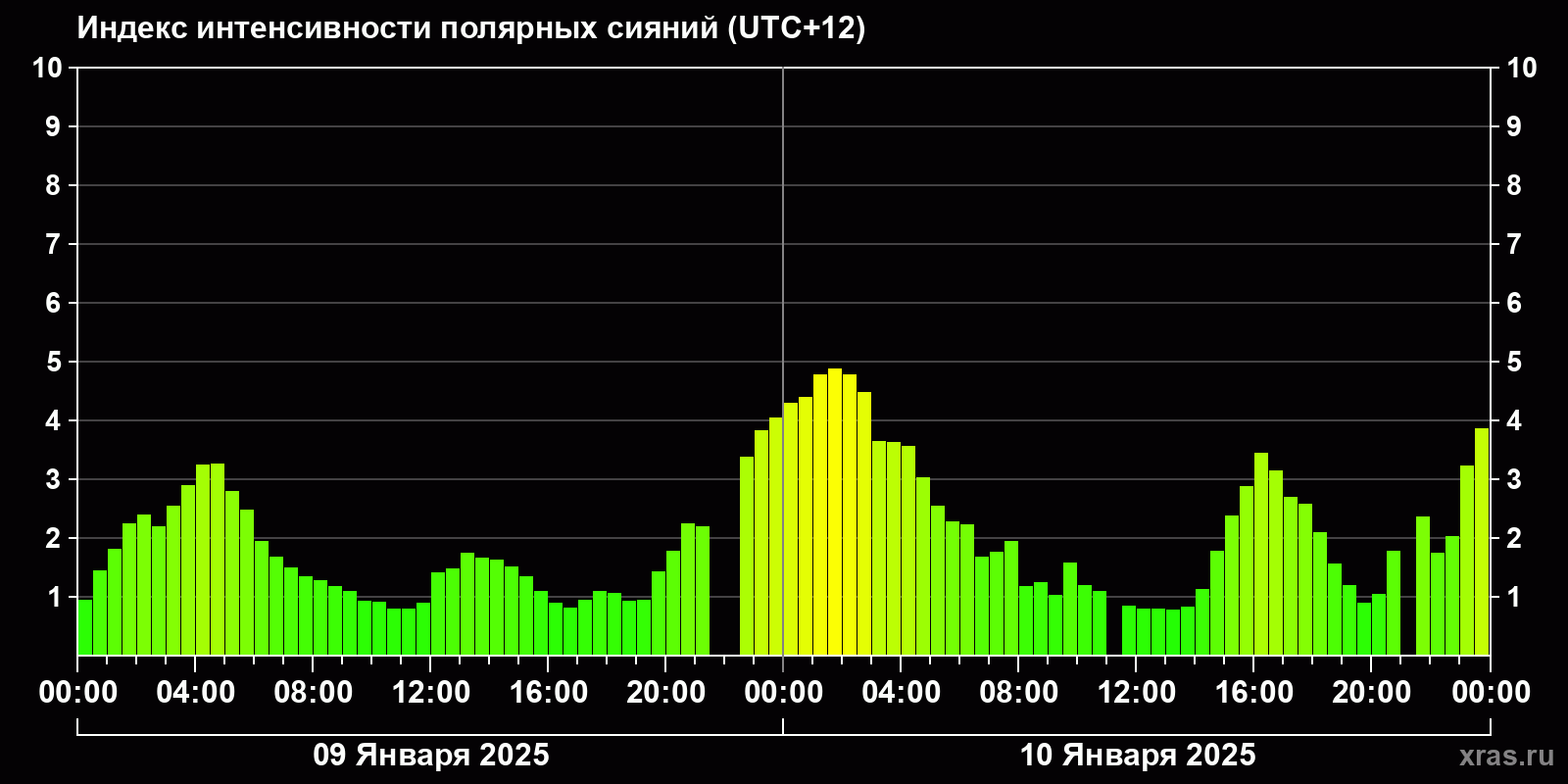 Изменения индекса интенсивности полярных сияний с 2025-01-09 по 2025-01-10 по местному времени