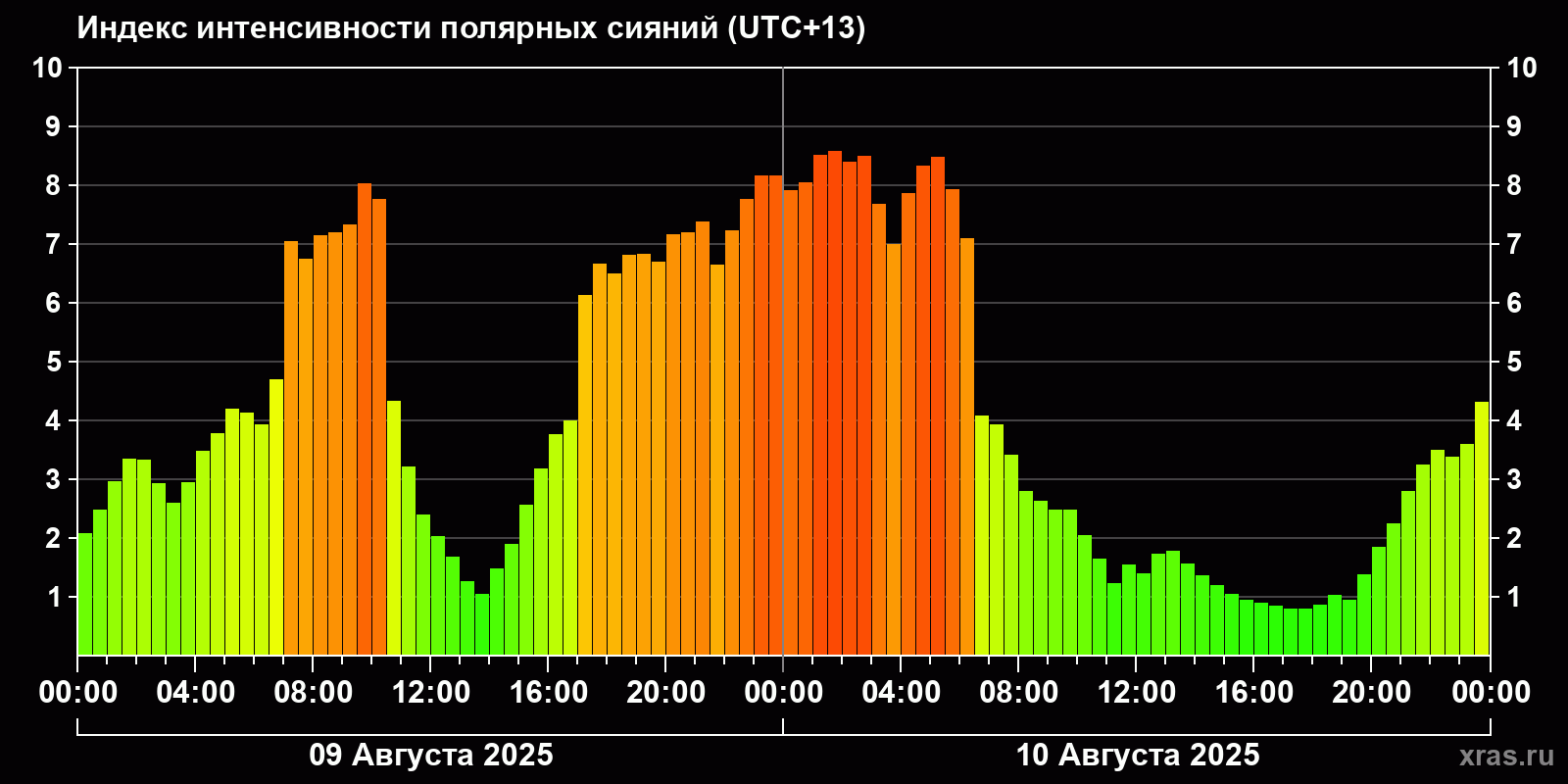 Изменения индекса интенсивности полярных сияний с 2025-08-09 по 2025-08-10 по местному времени