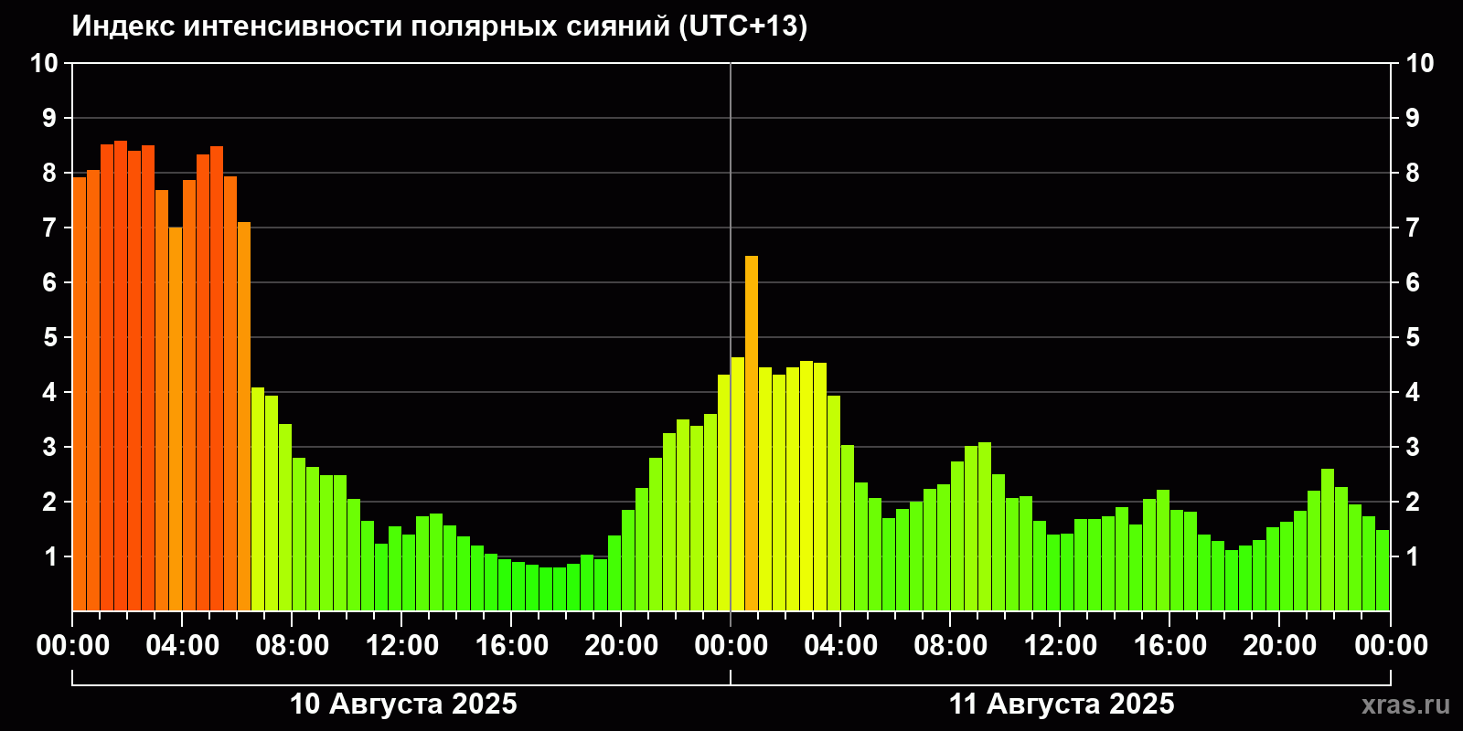 Изменения индекса интенсивности полярных сияний с 2025-08-10 по 2025-08-11 по местному времени