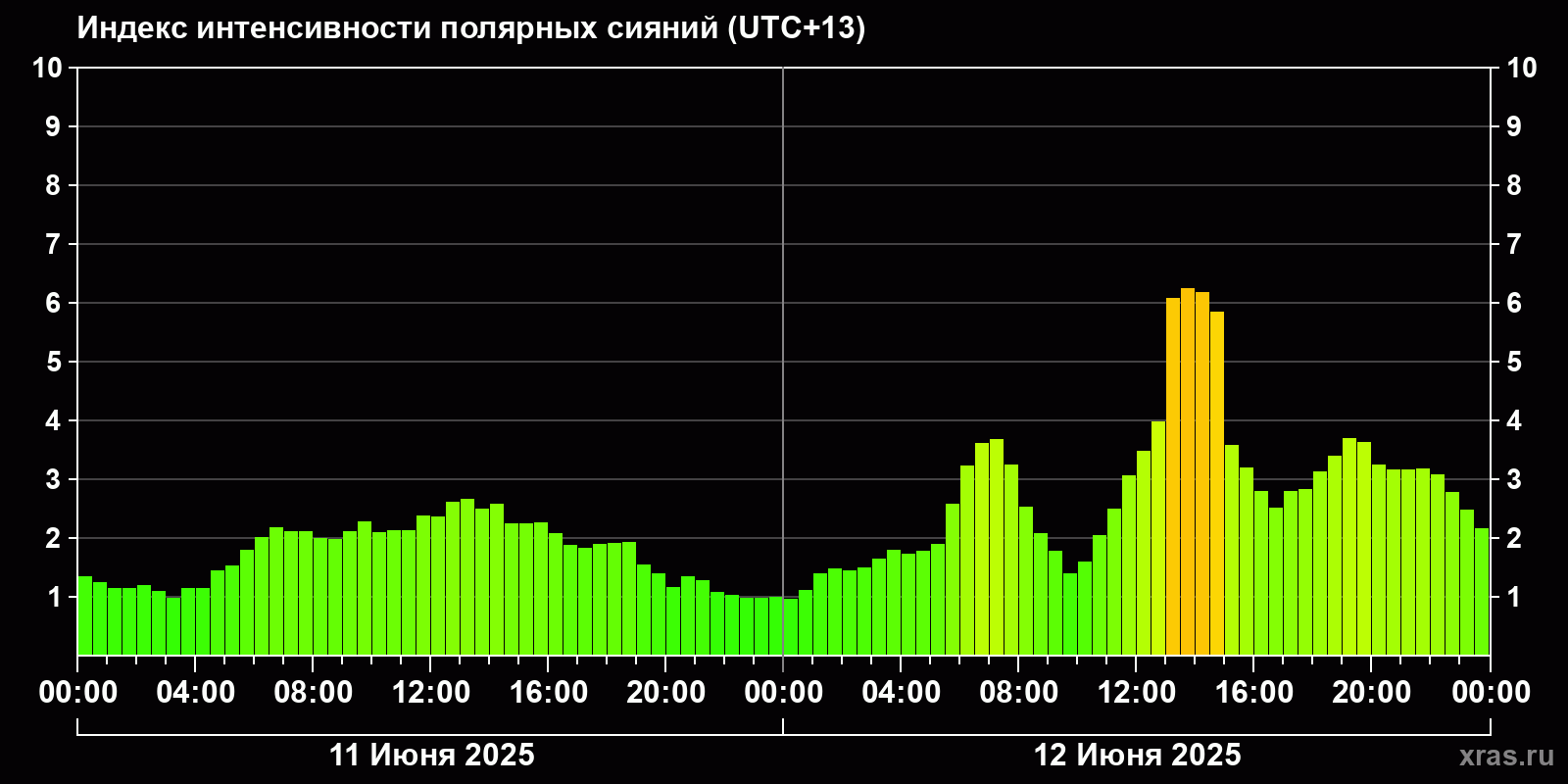 Изменения индекса интенсивности полярных сияний с 2025-06-11 по 2025-06-12 по местному времени