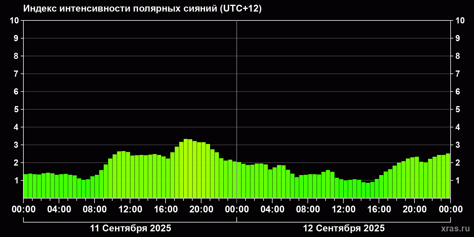 Изменения индекса интенсивности полярных сияний с 2025-09-12 по 2025-09-13 по местному времени