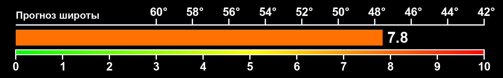 Индекс интенсивности полярных сияний и теоретически возможная широта наблюдений для ночного времени в западном полушарии по состоянию на 2025-11-13 23:59 (конец дня) по местному времени