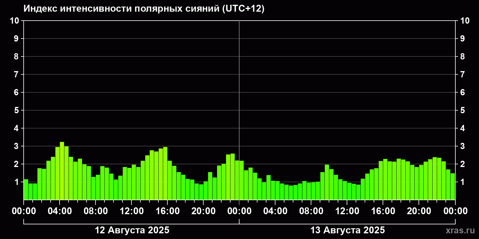 Изменения индекса интенсивности полярных сияний с 2025-08-13 по 2025-08-14 по местному времени